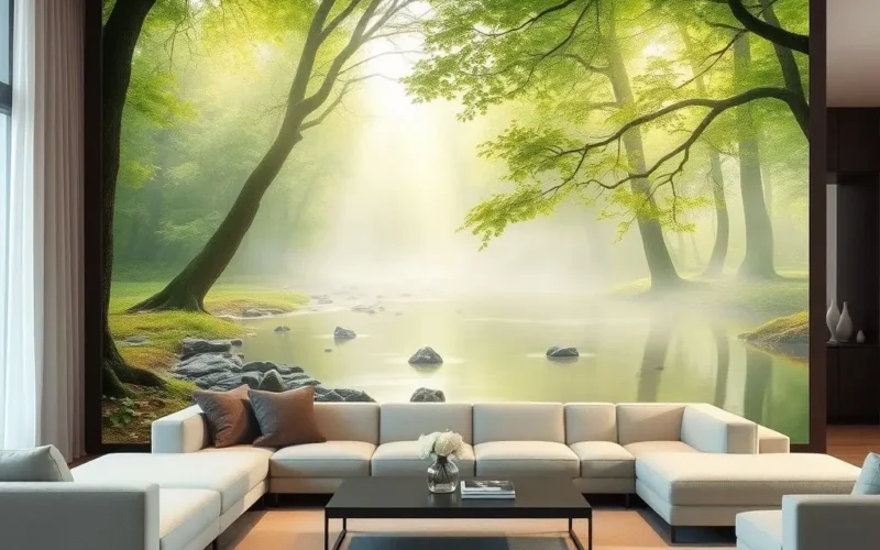A modern living room featuring an e-paper wall displaying a serene forest landscape, seamlessly integrated with minimalist decor.