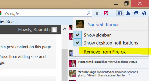 - If for some reason, you don’t like this feature and want to remove Facebook sidebar from your browser, click on Facebook button beside search box (icon with F symbol) and select Remove from Firefox.