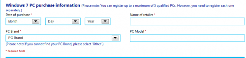 - In the section titled – Windows 7 PC Purchase Information, enter the purchase date to any date which is about 25 days earlier to the current date. You don’t need to enter your original purchase date of computer because the same won’t be verified. Just fill purchase date with any date within 1 month. In the model, brand and retailer section, Select Other in Computer brand name, enter any model and the name of any shop. For example – I entered in my case – Other Brand, XPS model, Amazon in retailer.