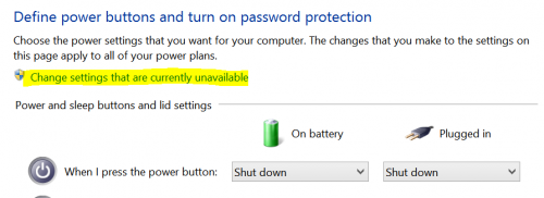 - Now click on Change Settings that are currently unavailable link located below the first paragraph of text written there. You can also change the default behavior of power buttons or your laptop lid here.
